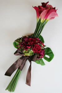 ユリ、アマリリス、カサブランカ、カラーなどの茎の長い花材のラインを活かして、束ねます。